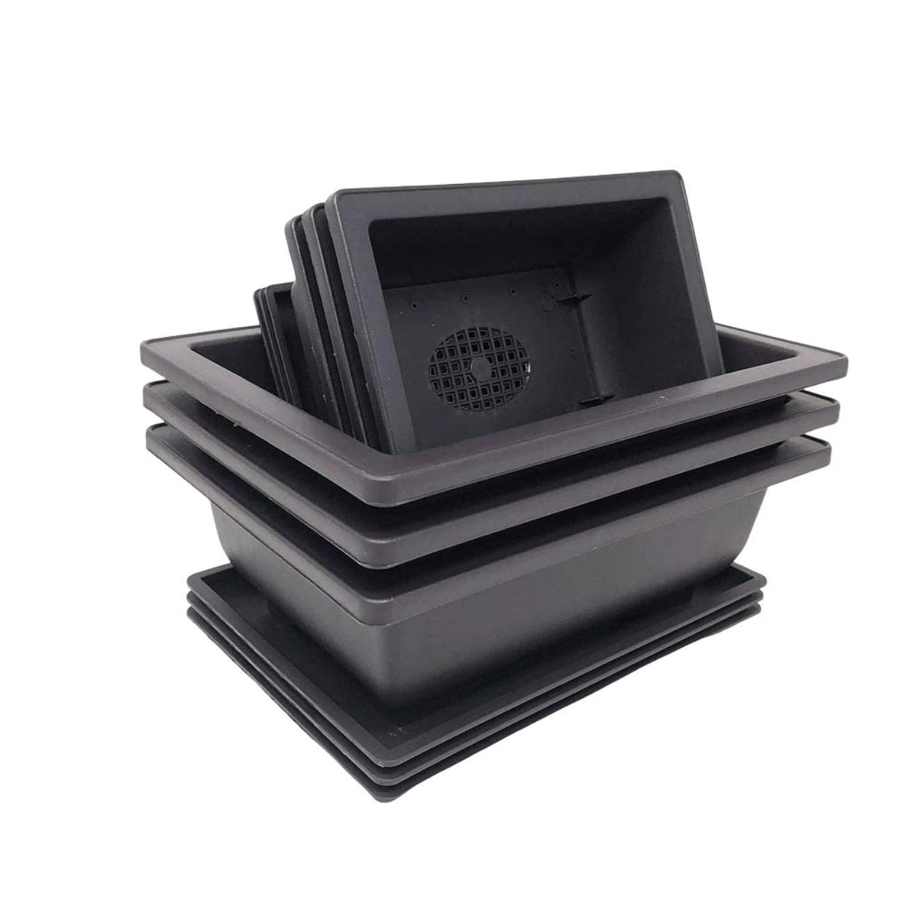 They have an ability to be stacked to make moving quick and easy. These pots have a built-in mesh to catch any bonsai soil that tries to fall through the drainage holes. These Bonsai pots and trays will retain their color and durability through rain, snow or sun for years to come. These Bonsai pots and trays are extremely economical.